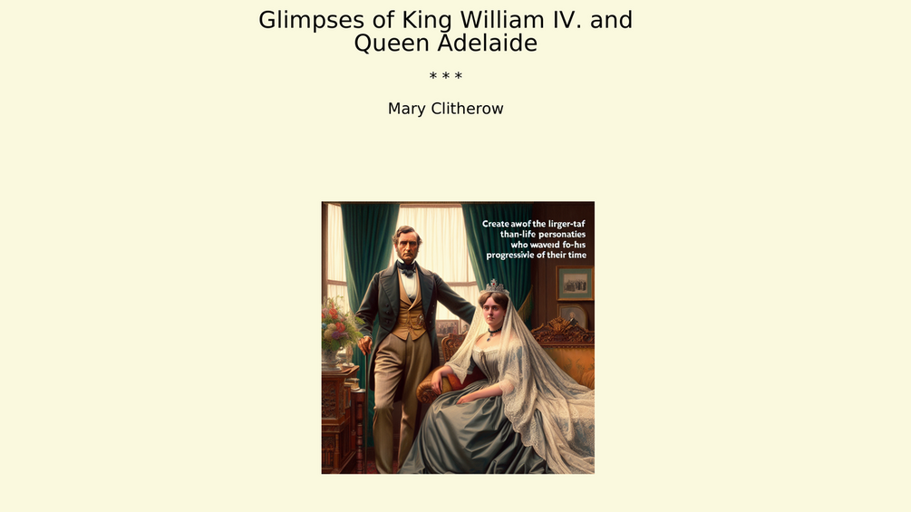 "Glimpses of King William IV. and Queen Adelaide" by Mary Clitherow offers a captivating insight into the lives of two prominent figures in British history. Through vivid anecdotes and detailed accounts, Clitherow paints a nuanced portrait of King William IV, known for his larger-than-life personality and progressive reign, and his beloved consort, Queen Adelaide, who stood by him with grace and dignity.